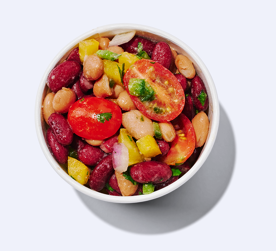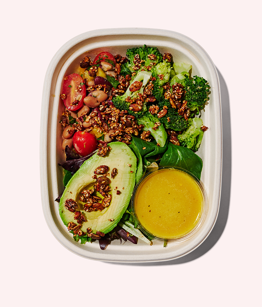 SALAD GREENS, BEAN SALAD, BROCCOLI, ½ AVOCADO, CRUNCHES, TURMERIC-GINGER