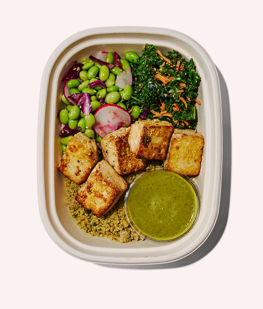 QUINOA SALAD, KALE-CARROT SALAD, EDAMAME CRUNCH, TOFU, LEMON-HERB SAUCE