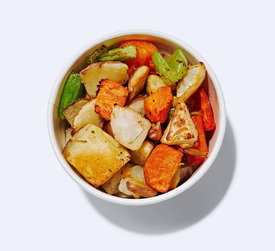 BROWN RICE, ROASTED VEGETABLES, GREEN BEANS, CHICKEN, SPICY AVOCADO